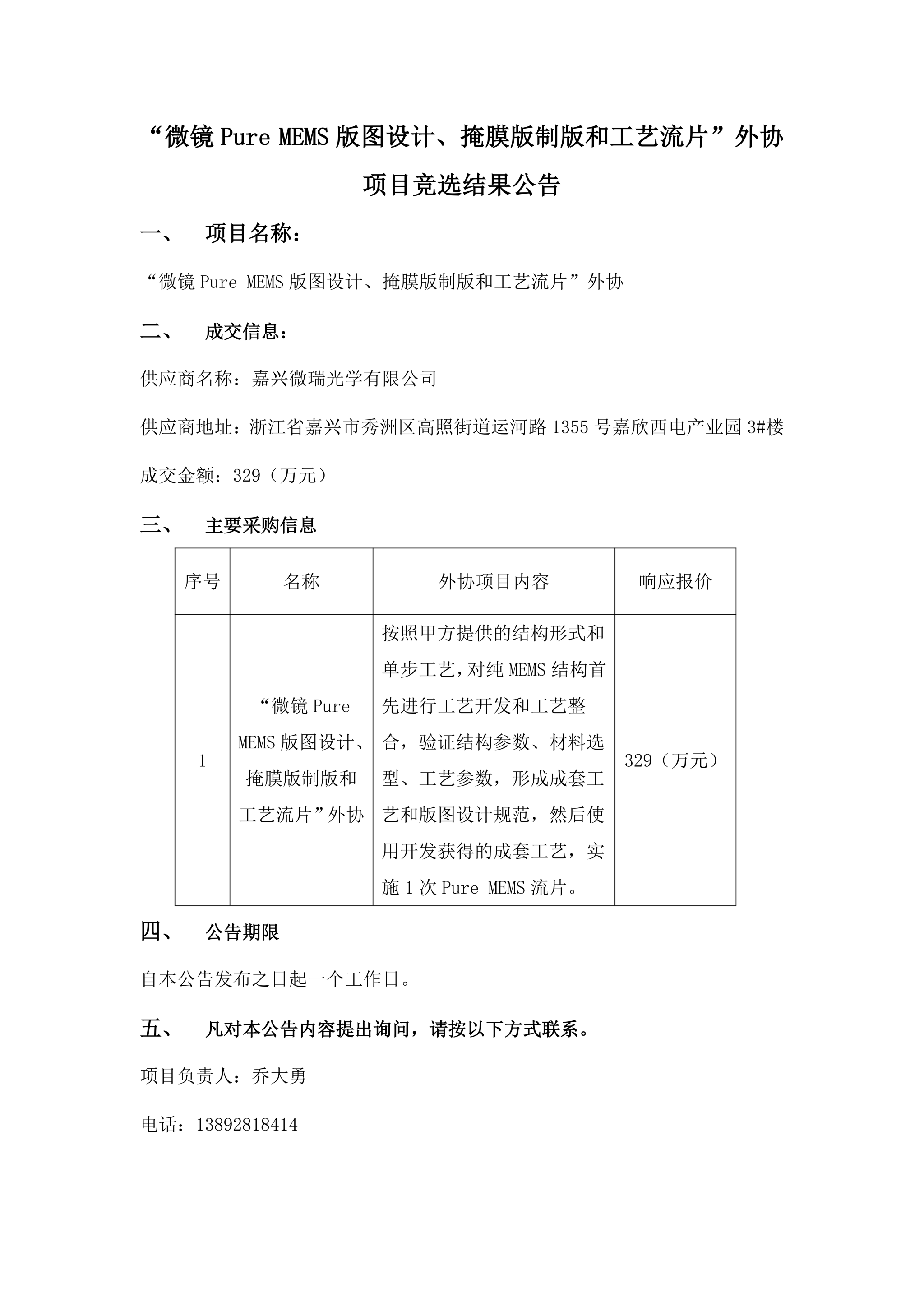 “微镜Pure MEMS版图设计、掩膜版制版和工艺流片”外协项目竞选结果公告